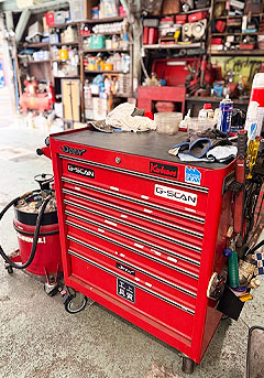 整備に必要な部品はしっかりとメンテナンスを重ねて長く使い続けています。大工さんがのこぎりを長く使うように、車の整備士も手にフィットする道具を大切に、大切に使います。新しい設備に飛びついて料金を値上げする工場が多い中、設備ではなく職人の腕で勝負。技術力でベストな車検を実現することを心がけています。